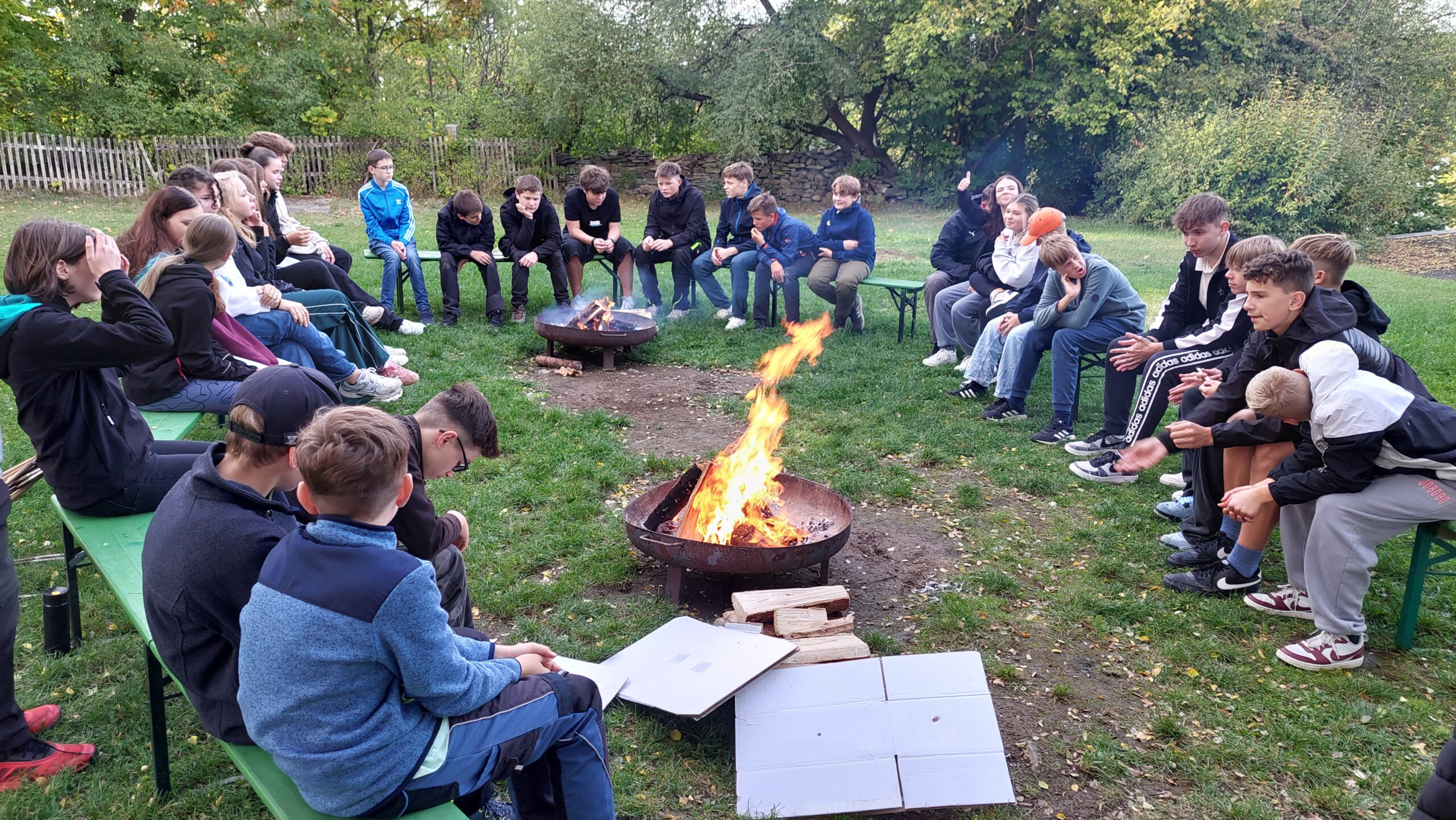 Am Dienstag arbeitete die Klasse 8-2 beim Hüttenbau und Survivaltraining im Wald, während die 8-1 am Vormittag intuitives Bogenschießen ausprobierte, Tischtennis spielte und am Nachmittag die nächstgelegene Stadt Oelsnitz erkundete. Bei Lagerfeuer und Stockbrot ließen alle den Tag gemütlich ausklingen.