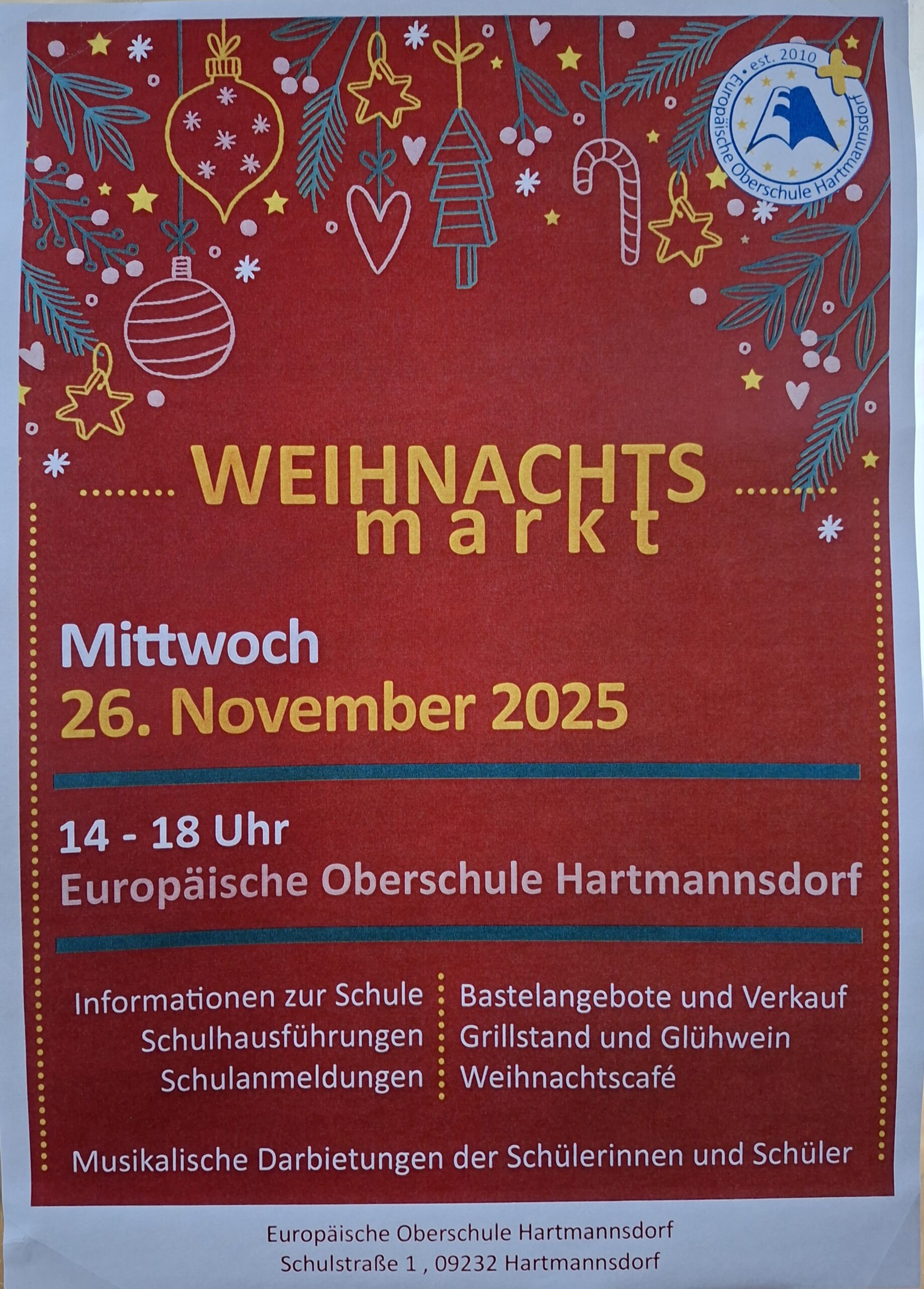 Am 26.11.2025 öffnete unsere Schule von 14 bis 18 Uhr ihre Türen zum Weihnachtsmarkt und Tag der offenen Tür. Ziel der Veranstaltung war es, die EOSH in einem weihnachtlichen Ambiente zu präsentieren und interessierten Gästen einen kleinen Einblick in das Schulleben zu ermöglichen.